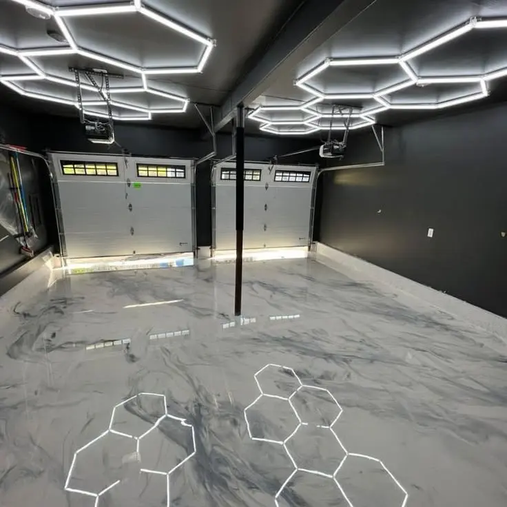 Our solid coatings offer a brilliant gloss finish and come in a wide array of colors. The best part is that our garage floor coating systems are UV resistant, ensuring they maintain their fresh look for years to come. Your garage floor will not only look fantastic but will also be ready for use the very next day. These surfaces feature a modern aesthetic with various texture options available. Whether for warehouses or garages, our solid color epoxy and polyurea systems will effectively cover the concrete, providing a dust-free, easy-to-clean surface with anti-slip features.